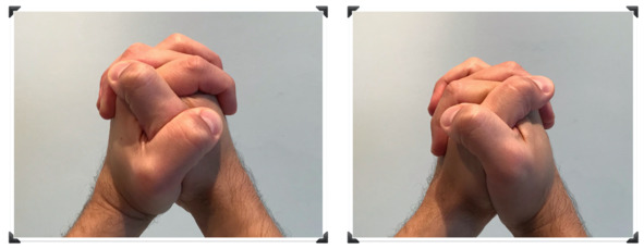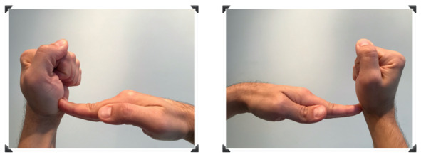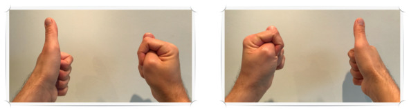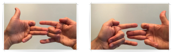 4. Следующим этапом делаем комбинацию – большой, указательный, мизинец в разогнутом состоянии, а средний и четвёртый пальцы в разогнутом состоянии на левой руке и наоборот комбинация на правой руке.