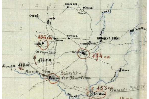 В материалах 62 стрелкового корпуса сообщается, что «отдельные эшелоны 170 сд, разгружаясь на станции Кузнецовка, подверглись бомбежке авиацией противника»33. Согласно сводке Оперативного отдела штаба Западного фронта, составленной к 23 часам 30 июня 1941 г., «170 сд начала выгрузку в районе Себеж. К 10.00 30.6 поступило семь эшелонов»34.