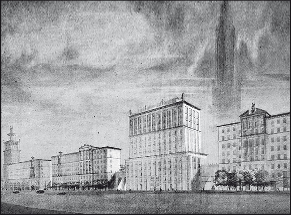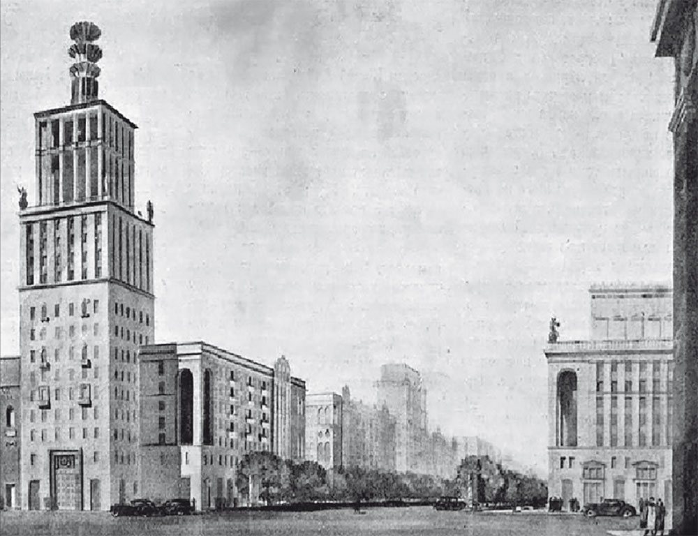 Так мог бы выглядеть Новый Арбат в 1940-е годы (архитекторы СЕ. Чернышев, А.М. Заславский, С.Н. Кожин, А.Д. Сурис)