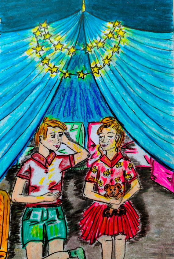 А на втором этаже дома, в детской комнате, брат с сестрой соорудили из большой белой простыни домик – палатку. Они перекинули простынь через верёвку, протянутую от стены к стене. Внутри домика дети повесили гирлянду в виде маленьких звёздочек. И устроившись на мягких подушках, смотрели на светящиеся тёплым жёлтым светом звёзды, представляя, что те настоящие.
