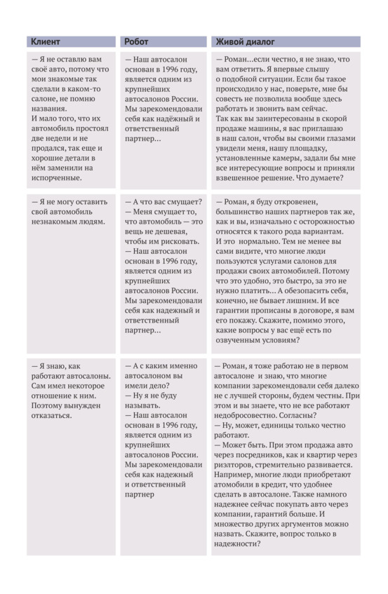 Приведем пример. Сотрудник салона, продающего подержанные авто, звонит лицу, который выставил объявление о продаже своего авто. Задача продавца – убедить владельца поставить его автомобиль на реализацию в салон. Клиент дает возражения (см. таблицу на с. 21).