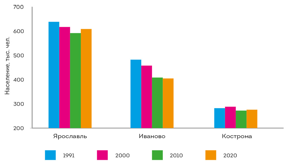 Несмотря на это, все три города теряют население. Наименее заметна эта тенденция в Ярославле, где с 2011 по 2019 годы число жителей росло; однако и здесь оно с середины 2000-х годов не достигает показателей советского периода (в 1991 г. в городе проживало 638 тыс. чел.), а в 2020-м вновь стало сокращаться (608,4 тыс. на 1 января 2020 г. и 604,5 тыс. летом 2020 г. после 609,8 тыс. на 1 января 2019 г.). Кострома к 2020 году по сравнению с 1991-м потеряла 2 % населения, а Иваново – 16,1 % (рис. 2.3.2).