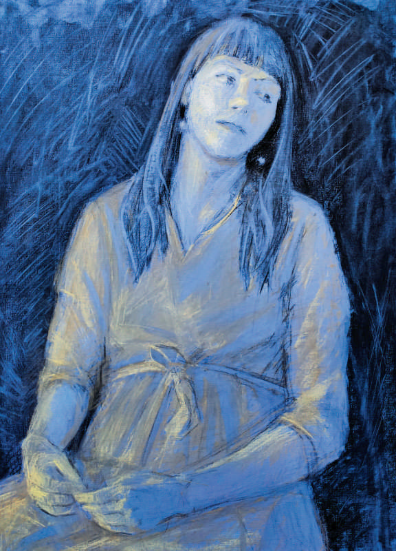 Студенческая работа, 2-й курс. 2020 г. Цветная бумага, угольный и пастельный карандаш. 57 х 43 см. На рисунке видны динамичные линии, передающие настроение и покой модели.
