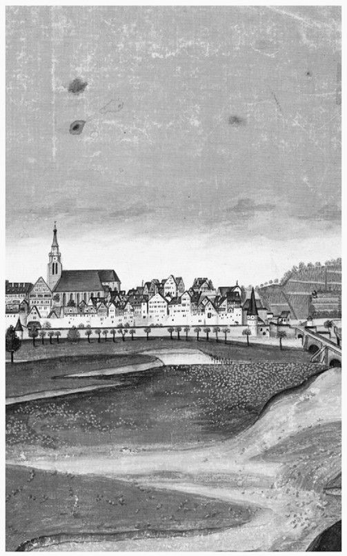 Рис. 1. Неизвестный художник. Вид на Тюбинген. Середина XVIII в. Акварель, темпера. Башня Гёльдерлина – первая справа