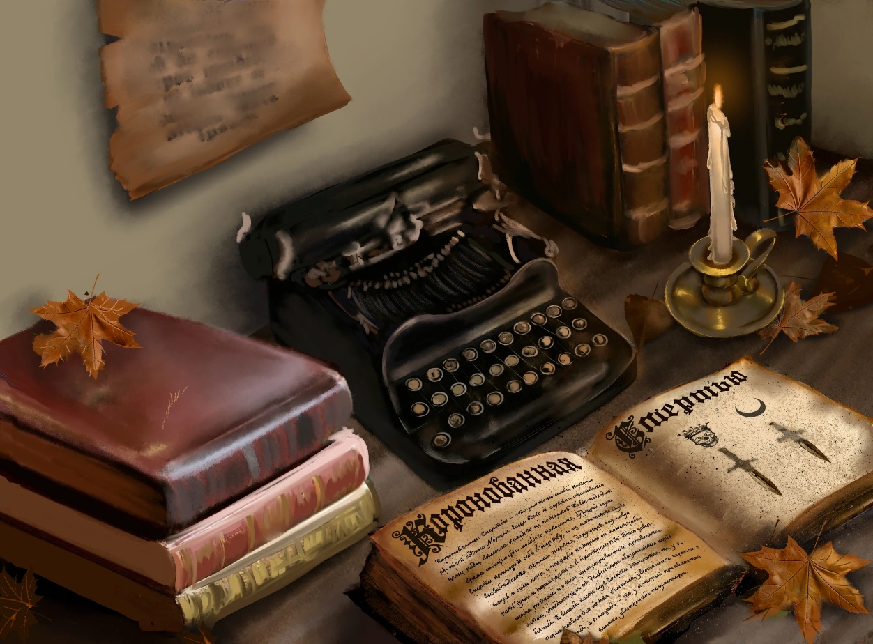 Я подхожу к столу в дальнем углу комнаты, на котором стоят различные рукописи и аптекарские склянки. Посередине стола стоит старинная печатная машинка, а рядом с ней лежит громадная книга, которой на вид около тысячи лет. Тусклый свет освещает эту небольшую комнату. Я, как заворожённая, дотрагиваюсь до обложки этого старинного гримуара, осторожно проводя пальцами по пыльной кожаной обложке с непонятными символами. Книга с грохотом открывается, и я с ужасом шарахаюсь назад. Страницы начинают быстро перелистываться, будто бы чья-то невидимая рука ищет нужную страницу.