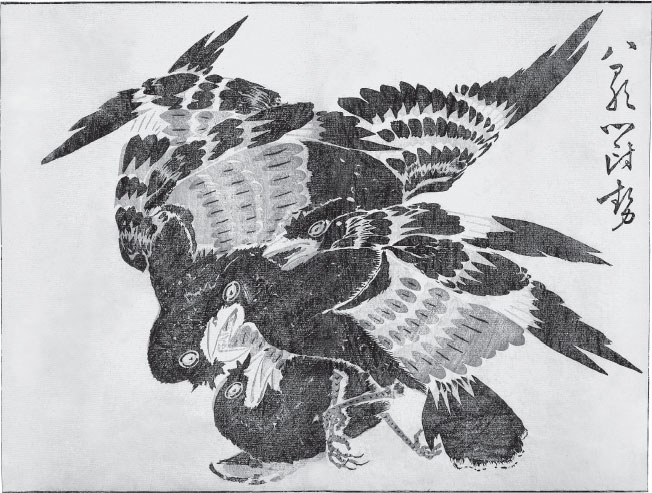 Бог взялся за веер и взмахнул им: «Раз уж здесь Итимокурэн[132], он в стороне не останется!» – и тут же юношу подбросило в воздух. Обезьяна и заяц расхохотались и захлопали в ладоши. Отшельник подождал, пока юноша оказался на уровне верхушек деревьев, в воздухе подхватил его в охапку, зажал под мышкой, и они улетели.