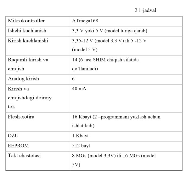 2.1-jadvalda Pro Mini Arduino platasinig xarakteristikalari keltirilgan.