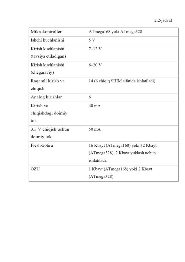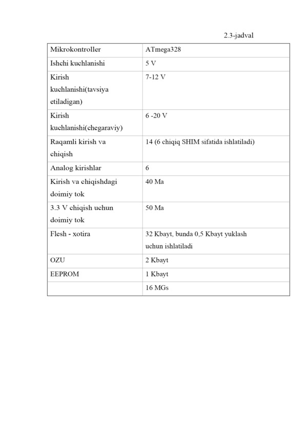Arduino UNO platasining xarakteristikalari 2.3-jadvalda keltirilgan.