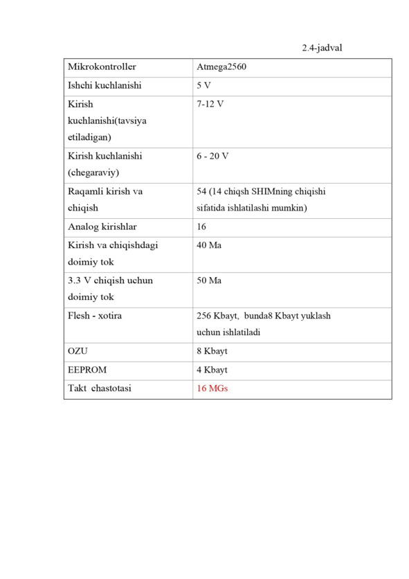 Mega Arduino platasining xarakteristikalari 2.4-jadvalda keltirilgan.