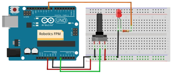 Ushbu bo’limda LEDning yorqinligini o`zgartiriladigan qurilmaning elektr sxemasini yig`amiz. Potensiometr yordamida 9-pinga ulangan LEDning yorqinligini o`zgartirishimiz mumkin. Potensiometrning ikki tarafdagi oyoqlari 5V va GND portlariga ulanadi, kuchlanish qiymati o`rta oyoqdan olinadi va Arduinoning A0 analog kirishiga ulanadi.