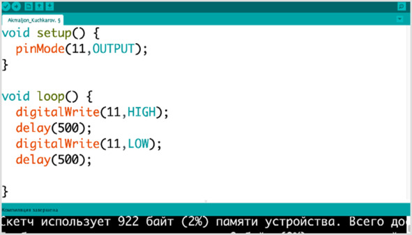 Xulosa. Barcha dasturlash tillarida bir xil kodning bir necha marta bajarilishini ta`minlovchi boshqaruv buyruqlari to`plami (while sikli), tegishli kodni tanlash (if shartlarida) va joriy kod qismidan chiqish bo`yicha ko`rsatmalar mavjud. Arduino IDE dasturlash tilida C/C++ tilidan kerakli boshqaruv indikatorlarining ko`pini olgan, shuning uchun ularning sintaksisi deyarli bir xil.