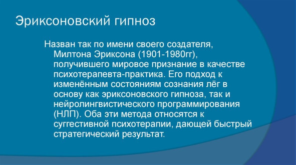 Милтон Эриксон (1901—1980) считается одним из наиболее значимых гипнотерапевтов послевоенного периода. Его интерес к гипнозу пробудился в 1923 году после посещения семинара, посвященного этому методу. Он оставил после себя ряд публикаций – книг и статей в периодических изданиях. В 1960-е годы Эриксон способствовал развитию нового направления в гипнотерапии, получившего название «эриксонианский подход». В отличие от традиционных гипнотических техник, оно отличалось использованием непрямых внушений, обилием метафор, приемов дезориентации и двойных сообщений.