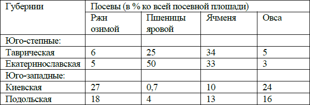 Посевы продовольственных культур для крестьянства юго‑запада имели больше потребительский характер, для района же юго‑степи – товарный. В южно‑степной полосе сеяли главным образом пшеницу и ячмень – хлеба товарные, в юго‑западной – рожь и овес, которые в значительной доле потреблялись в самом крестьянском хозяйстве. Это распределение иллюстрируется следующей таблицей14:
