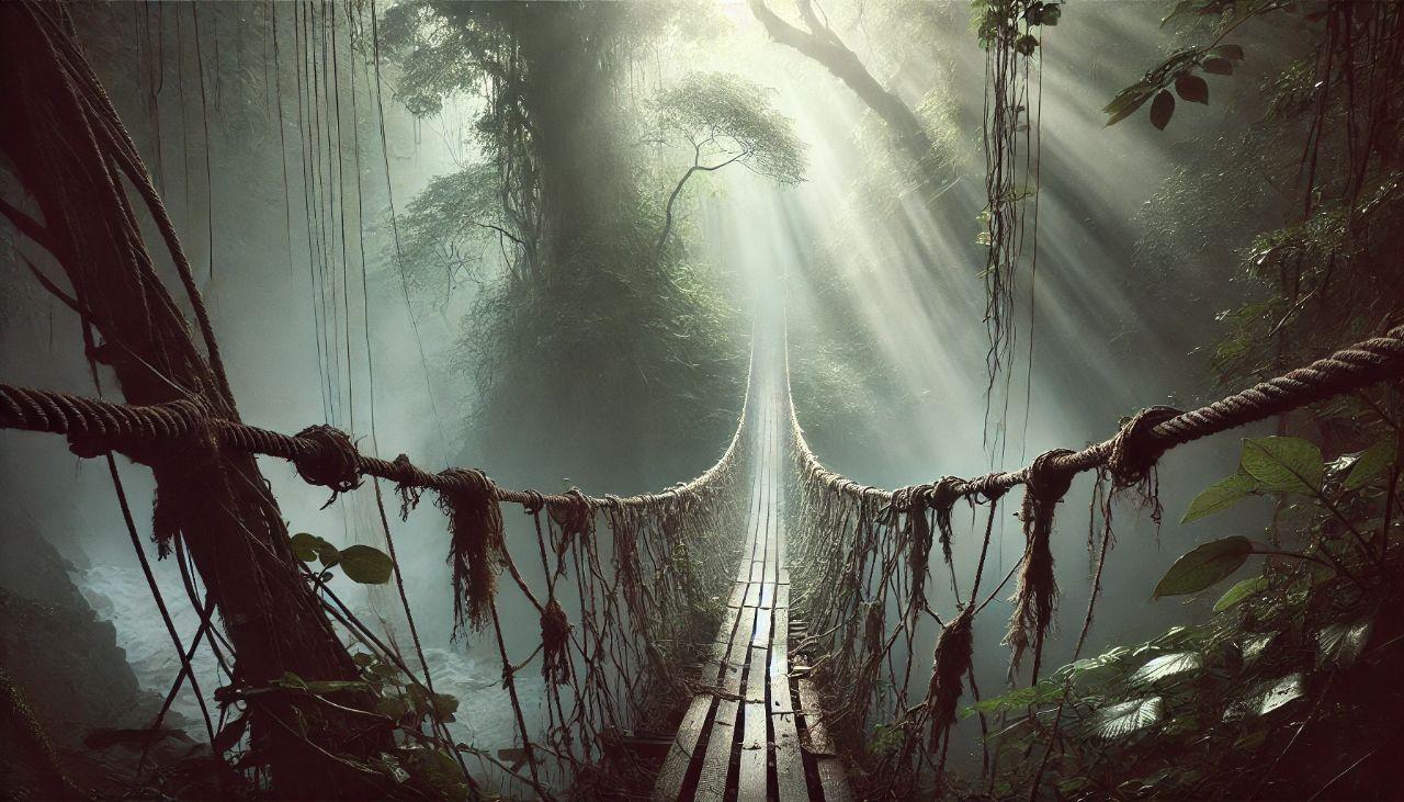 Следуя за метками, они скоро увидели впереди свет и вскоре оказались на узкой скалистой площадке перед глубоким ущельем, через которое тянулся старый подвесной мост из лиан. Ветер свистел, а мост тревожно раскачивался над пропастью.