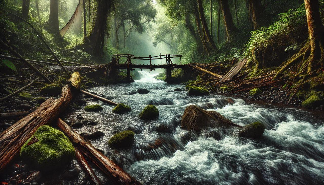Вскоре перед ними возник бурный ручей с холодной, стремительной водой. Моста здесь почти не осталось, лишь скользкие мшистые камни служили опасной переправой.