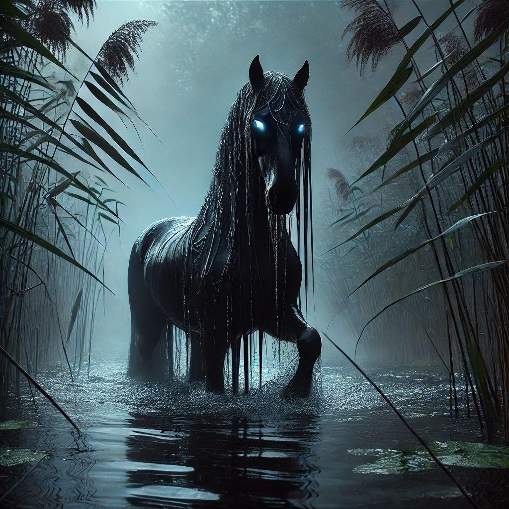 Обернувшись, он замер, поражённый увиденным. Из воды появилась фигура необыкновенной красоты и таинственности: лошадь с шерстью, переливающейся, словно мокрые камни под луной, и гривой, струящейся, будто волны. Её глубокие глаза завораживали и звали за собой, обещая покой и тайны, спрятанные на самом дне реки.
