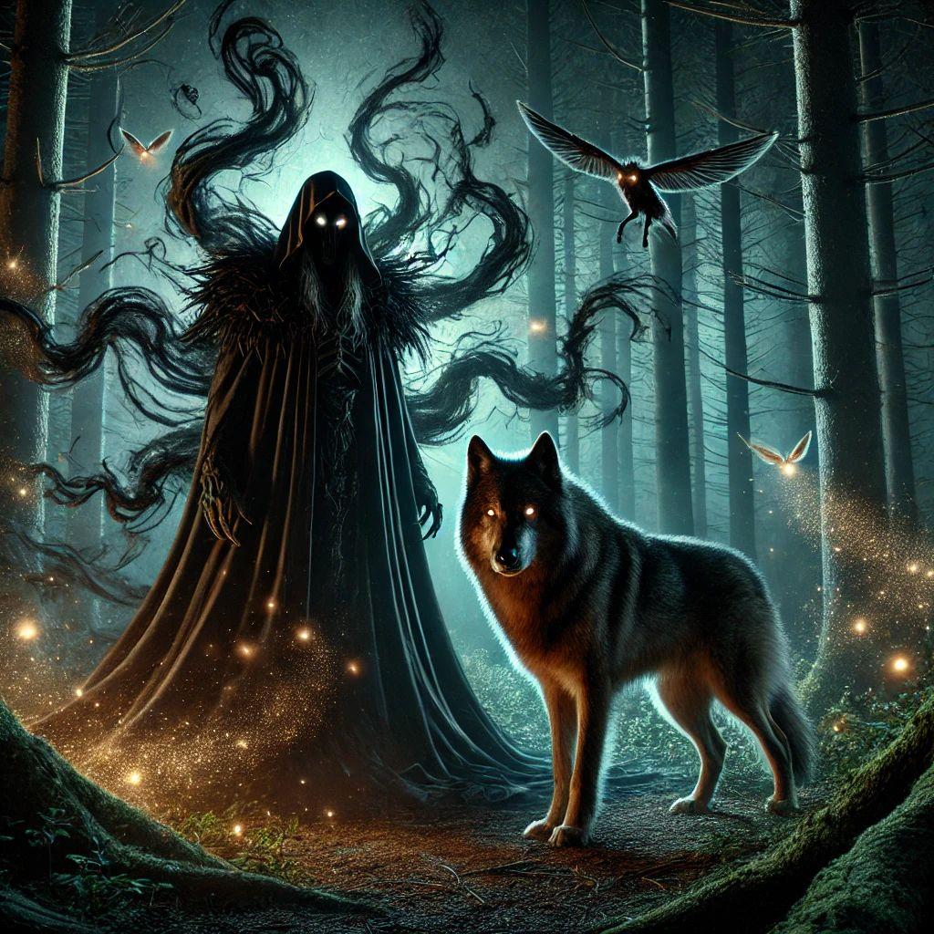 Но едва замок щёлкнул и дверца клетки отворилась, как ледяной ветер ворвался на поляну, отбросив Варну на землю. Тени начали сгущаться вокруг, превращаясь в густую, осязаемую тьму. Из хижины медленно вышел Серый колдун, окутанный холодным, мрачным сиянием.