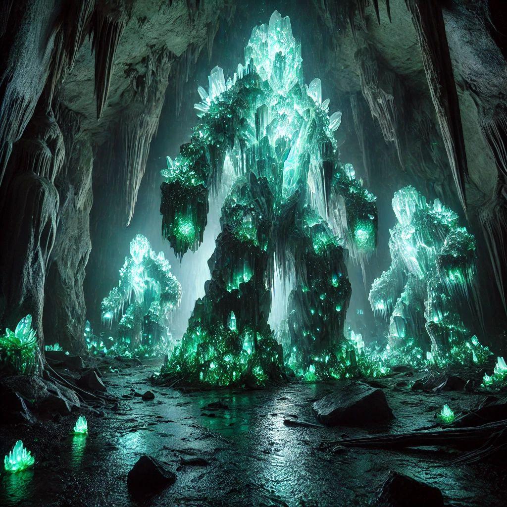 Вдруг из глубины зала донёсся низкий, зловещий звук – будто кто-то скрёб камнем по камню, заставляя дрожать пол под ногами. Из тёмных углов медленно выплывали огромные фигуры – высокие и тяжёлые, словно горы, их тела состояли из сверкающих кристаллов. Каждый шаг сопровождался глухим хрустом, будто внутри них перекатывались невидимые камни.