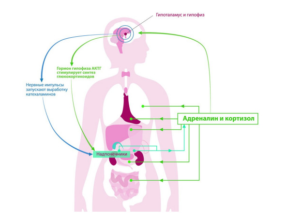 Всё начинается с выброса гормонов. Надпочечники, как по сигналу тревоги, выбрасывают в кровь адреналин и кортизол. Эти гормоны вызывают целый каскад изменений: