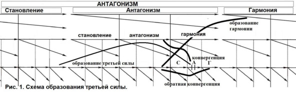 Смысл конвергенции – синтез становления и антагонизма, предшествующих гармонии, но при условии примата становления. А так как становление утратило примат уже при переходе в антагонизм, то требуется третья сила, восходящая к становлению высшего противоречия. Именно это высшее становление обеспечивает сохранение примата становления над антагонизмом в условиях конвергенции гармонии антагонизма гармонии с гармонией предыдущего антагонизма (Рис.1).