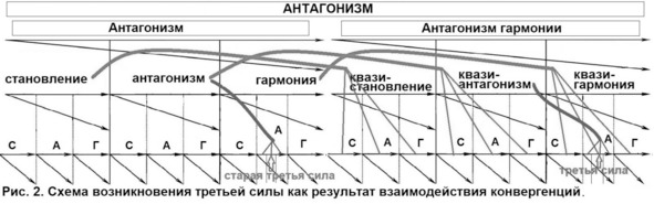 Но тут такое дело. Квазигармония антагонизма гармонии испытывает двойную конвергенцию: с гармонией предшествующего антагонизма и с квазиантагонизмом антагонизма гармонии. На рис. 2 показана конвергенция (прошедшая ранее) гармонии с антагонизмом (линия слева). Эта конвергенция на стадии антагонизма гармонии вызвала образование предыдущей третьей силы, которая создала нашу гармонию, развитие антагонизма которой мы рассматриваем справа рисунка. При этом новая третья сила образовалась в ходе конверсии с антагонизмом гармонии, в котором была создана старая третья сила. А так как третья сила отрицает конвергенцию, то новая третья сила будет отрицанием старой третьей силы. Поэтому новая третья сила будет отдалённой аналогией предшественнице, старой третьей силы.