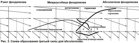 Если рассматривать феодализм в качестве высшего антагонизма, то в антагонизме антагонизма гармонии междоусобицы (антагонизм феодализма) в ходе конвергенции с антагонизмом междоусобицы возникает третья сила в виде бюрократической системы прообразом которой послужила первичная феодальная пирамида становления феодализма. Прообраз бюрократической системы, действующей на основе инстинкта доминирования, позволил перейти к гармонии антагонизма гармонии междоусобицы, а затем и к гармонии гармонии междоусобицы. После чего последняя вынудит гармонию антагонизма междоусобицы предпринять обратную конвергенцию (учредить свою бюрократию), что закончится распадом междоусобицы и образованием абсолютизма (гармонии феодализма), который будет противостоять гармонии гармонии междоусобицы (Рис. 3).