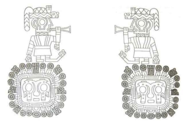 Меркурий – самая близкая к Солнцу планета. В общем изображении календаря на Вратах Солнца в Тиуанако – рис. 17, найти Меркурий просто. Ведь эта планета ближайшая к Солнцу, следовательно нужно найти фигуру, изображенную вплотную к цепочке меандра. Такая фигурка уже была найдена и в разделе «Два типа изображений Меркурия на календаре Тиуанако». В результате определена фигурка ранних времен, изображенная на рис. 10Б. Повторяем этот рисунок – рис. 52.