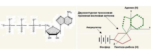Шестигранные плиты были применены не случайно. Пирамида, как гигантский фокусирующий кристалл, использовала волновые излучения окружающей среды, и в первую очередь излучения высшего пространства, т.е. в пирамидах был реализован принцип межпространственной передачи энергии, и ни с какими другими плитами обшивки, кроме как шестигранной формы, пирамида не могла бы работать в принципе! Сущность этого применения заключается в том, что в пирамиде был реализован тот же принцип передачи энергии, что и в живой материи. Именно способность живого получать для своего функционирования энергию соседнего пространства, более высшего по уровню энергетики, есть принципиальное и главное отличие живого от не живого. Научные выкладки об этом можно найти в работах Ю. Бабикова по биологии живого. Приведем химическую формулу биологического передатчика и его аналогичную схему глазами физика (рис 5). ДНК