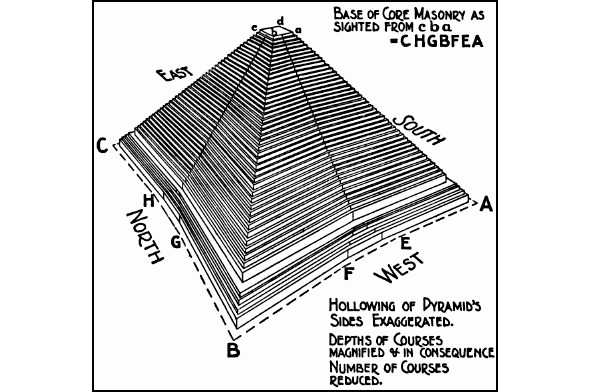 Эта странная особенность не была впервые обнаружена в 1940 году. Это было продемонстрировано в Описании Египта (Том V, пл. 8) (La Description de l’Egypte in the late 1700’s (Volume V, pl. 8) в конце 1700-х годов. Флиндерс Петри заметил опустошение в основной кладке в центре каждой грани и написал, что он «постоянно наблюдает, что эти провалы составляли от ½ ° до 1°" – рис. 8.
