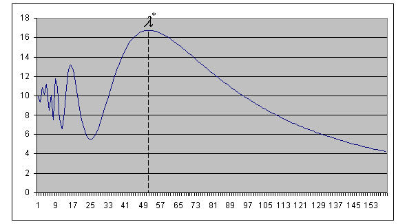 Рис. 73А. Зависимость коэффициента направленного действия D от длины волны [54] для пирамиды Хуфу. Оптимальная длина волны – 92 м