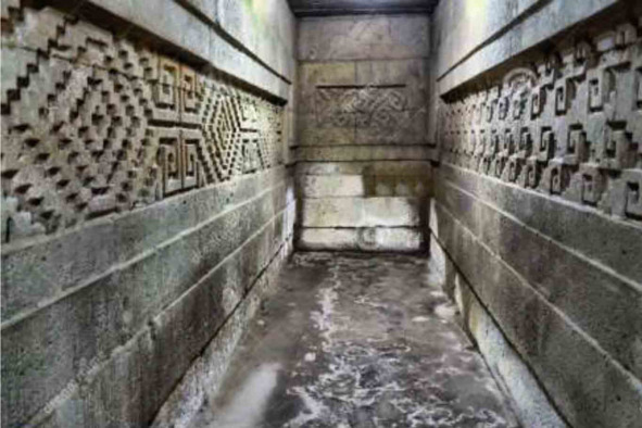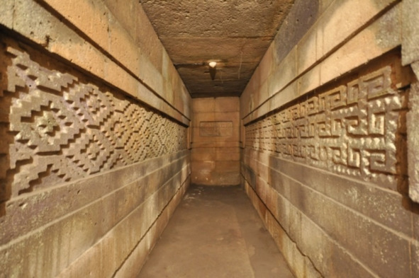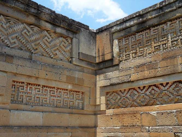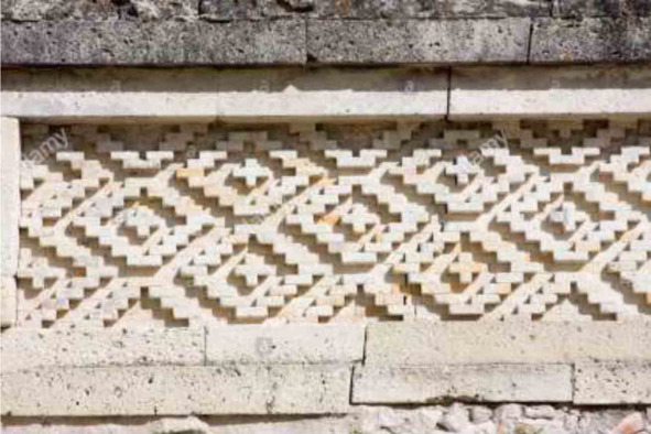 Орнаменты в храме Mitle в Мексике (рис. 35 – рис. 39) имеют вид. аналогичный колоннам вблизи Ольянтайтамбо, изображенным в книге Э. Скуайера (рис. 19, рис. 20). Однако количество ступеней во взаимно перпендикулярных направлениях разное. Если в Тиуанако автор обнаружил структуры с 4-я, 7-ю и 12-ю ступенями, то в Митле это количество составляет: 16 (рис. 38 и рис. 39) и от 4-х до 32 – на рис. 37. Так как внешний вид этих узоров совпадает с узорами на колоннах, показанных в книге Э. Скуайера, то можно предположить и об аналогичном предназначении, о котором автор писал выше.
