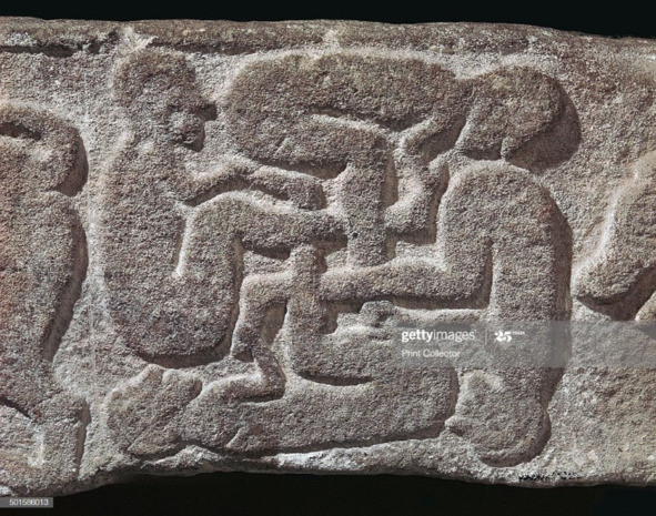Рис. 43. Human swastika motif from a Pictish recumbent grave-slab, at Meigle Museum, Perthshire, 7th century. Мотив человеческой свастики из захоронения в Пиктише, в музее Мейгл, Пертшир, 7 век [168]