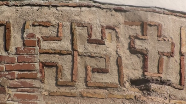 Большинство храмов таких как Киево-Печерская Лавра были отреставрированы духовенством. Но, к счастью, в Чернигове сохранились два храма X – XI в., построенные при Антонии Киево-Печерском, который выкопал там же пещеры. Камни, росписи, кладка, сохранили то, что на них изображали изначально. И вот сюрприз, под побелкой храмов, забеленных попами, мы видим сложные орнаменты креста с 4-х угольной структурой (рис. 45) свастики, и свастические символы, похожие на выпуклые изображения в Баальбеке (рис. 28 – рис. 30).