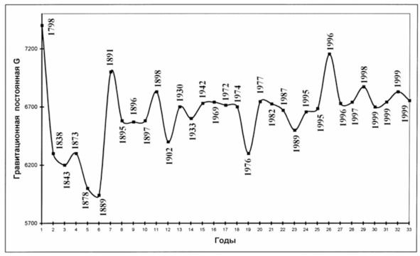 Рис. 47. График изменения гравитационной постоянной в период с 1798 года по 1999 год из работы Э. Н. Халилова [50].
