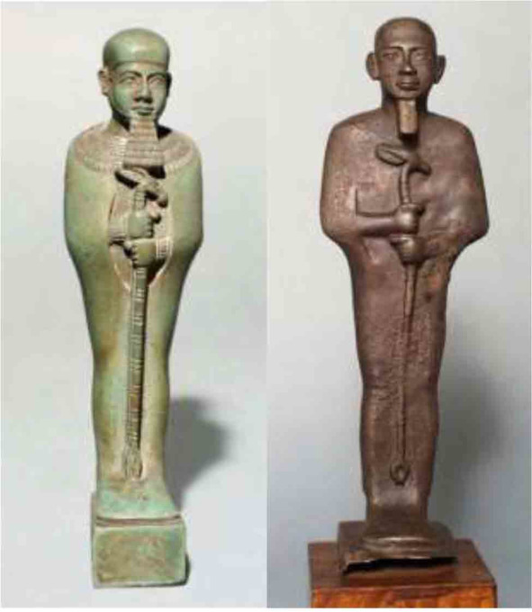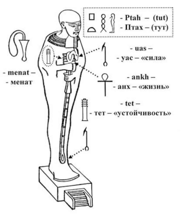 Рис. 50. Статуэтка бога Птаха из книги У. Баджа «Мумия» с символом жизни – анх (ankh) и жезлом силы и власти – уас [56]