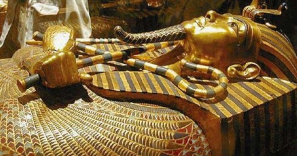 Мумию фараона в гробнице снабжали двумя жезлами – хеком или хекетом (выглядел как жезл с крюком) и нехеку (выглядел как жезл с плетью-трехвосткой). Именно с этими артефактами был погребён Тутанхамон. Руки ему скрестили на груди в виде косого креста, а в ладони вложили символы власти – рис. 59.
