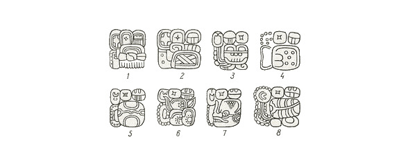 Для записи чисел майя пользовались двумя системами цифр. Первая, более простая и использовавшаяся для написания любого числа, имела только три знака: стилизованное изображение раковины для нуля, точки для единицы и горизонтальной черты для пяти. Отнесение той или иной цифры к разряду единиц, двадцаток (1 X 20), четырех сотен (1 X 20 X 20), восьми тысяч (1 X 20 X 20 X 20) и т. д. определялось порядковым положением данной цифры, как и в современной системе записи, но с той разницей, что периоды увеличивались не справа налево, как у нас, а снизу вверх. Таким образом, число, записанное по системе майя, представляло собой вертикальный столбец. Вторая система цифр, употреблявшаяся исключительно для записи чисел, связанных с календарем, представляла собой четырнадцать иероглифов в виде голов божеств верхнего мира, обозначавших числа от 1 до 13 включительно и нуль. Примеры применения этих цифр в «начальных сериях» довольно многочисленны; значительно реже встречаются в надписях так называемые персонифицированные, или декоративные, иероглифы, изображающие различных мифических персонажей и животных, передающие патроны месяцев, цифры, иероглифы единиц календарного счета, дни и месяцы в циклической дате.