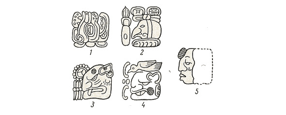 Рис. 9. Иероглифы, определенные Т. Проскуряковой [126]. 1 – рождение, 2 – вступление на трон, 3 – правитель Йашчилана «Щит-Ягуар», 4 – правитель Йашчилана «Птица-Ягуар», 5 – иероглиф, предшествующий женским именам и титулам