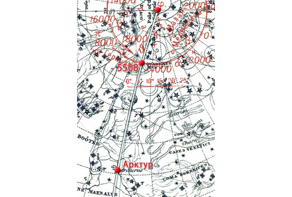 На рис. 7 мы восстановили картину, которая была видна на небе в 5508 году до н. э. В этом году состоялось уникальное астрономическое событие. На одной линии выстроились: центр эклиптики – точка, через которую проходила в то время ось вращения Земли, – ярчайшая звезда северного полушария Арктур. Почему это событие считалось уникальным? Потому что следующий раз аналогичный порядок указанные астрономические объекты займут только через 25750 лет. Последнее число составляет точное (на сегодняшний день) значение лет, за которые ось Земли совершает свою прецессию.