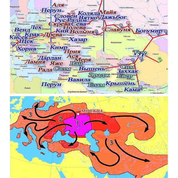 Существует «общепринятая» версия происхождения так называемых «индоевропейцев». Она изложена в нижней части рис. 20. А в верхней его части показано расселение русских и некоторых «соседних» племён. Эта работа произведена с помощью реконструкции по фольклорным, мифологическим и иным данным. Как видим, обе системы совпадают вплоть до мелочей.