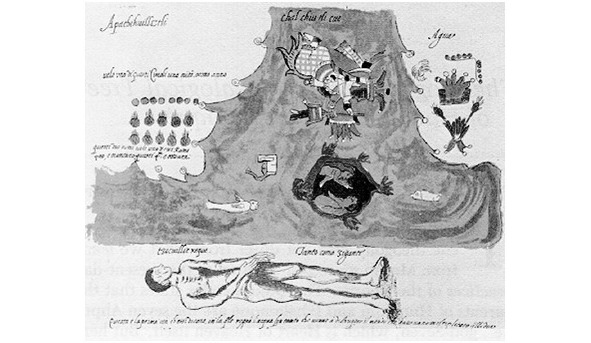 – в тексте «История мексиканцев по их рисункам» говорится, что сам Кецалькоатль (Венера) послал с небес вниз дождь из огня и после этого наступил потоп; это случилось «в последний год солнца Чальчиутликуэ, как рассказывали, с неба лилось такое огромное количество воды и в таком избытке, что сами небеса упали, и воды унесли всех;