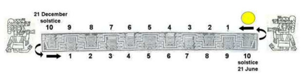 Фриз, который находится в нижней части Солнечных Врат, показывает, как следует орбита Солнца вокруг колонн, считая в двадцатых, то есть 10 от одного солнцестояния до другого солнцестояния плюс 10 для обратного пути.