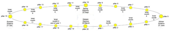 Имеется одиннадцать столбов на календарной стене. Каждая колонна отмечает положение заходящего солнца на 1/20 орбиты Земли, а сидерический лунный месяц соответствует расстоянию между полутора столпами, представляющими 3/40 орбиты.
