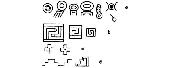 Изображениях Верховного Бога (Виракочи), а также его пернатых божеств или крылатых спутников на Вратах Солнца в Тиуакане состоят из множества определенных элементов, в виде геометрических фигур. Впервые это определил Артур Познанский, он выполнил серьезную работу по изучению этих элементов, встречающихся и на других памятниках [19]. Он классифицировал их в соответствии с изображенным объектом (животное, рыба, глаз, крыло, звезда и т.д.) или понятием (Земля, небо, движение и т.д.). Познанский первым выяснил, что круги и овалы всевозможных цветов и размеров служат для обозначения Солнца, Луны, планет, комет и других небесных тел (рис. 32а), что на барельефе часто встречается отображение связи Небо—Земля (рис. 32b) и что доминирующими символами являются крест и ступени (рис. 32с). В последнем элементе, лестнице, он усмотрел «фирменный знак» Тиуанако – его памятников и всей цивилизации, – откуда этот символ распространился по всей Америке. Он признал, что этот знак напоминает зиккураты Месопотамии, но поставил под сомнение возможность присутствия шумеров в Тиуанако [19]. Все эти особенности усиливали ощущение Познанского, что Врата Солнца являются частью большого комплекса в Тиуанако, который выполнял функцию обсерватории.