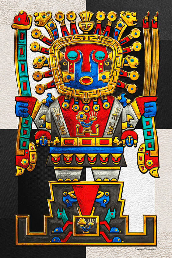 Рис. 39. Сосуд культуры Уари (I в. н.э. | Золотая фигура Бога Виракочи времен культуры Инков. Число звеньев цепочки меандра – 14, Меркурий имеет 4 квадратика сверху [35]