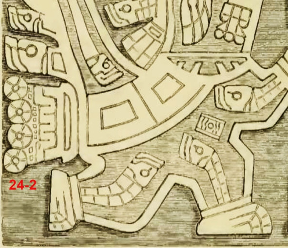Следует отметить еще одно обстоятельство. Напротив основания значка Юпитера на всех трех рядах пернатых божеств изображена нога. Причем в период до последней катастрофы (поз 24—3 на рис. 71), нога имеет черный фон, что свидетельствует о том, что произошла ранее катастрофы. Этот же факт, как уже было отмечено, запечатлён четырьмя разбитыми мордами ягуаров. Теперь передвигаемся к позиции 24—2 на рис. 71, или к среднему ряду пернатых божеств. Именно в эту эпоху произошла последняя катастрофа. Что же мы видим? Рядышком с продолговатой эллипсообразной основой значка Юпитера, т.е. самого Юпитера, расположена нога с тремя белыми пальцами в одну сторону и одним пальцем в противоположную сторону. Это изображение ноги отличается от ноги в нижнем ряду. Что же произошло? Здесь применен принцип аналогии. Четыре сформированные спутника Земли распределены аналогично: три в одной стороне четвертый в противоположной.