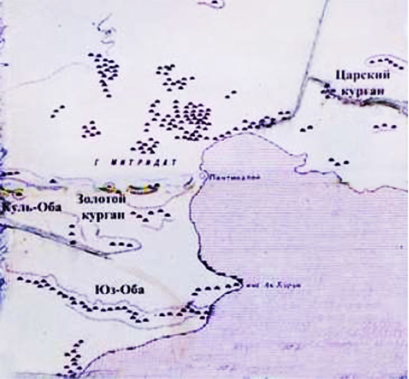 После присоединения Крыма к России в 1783 году, первые российские путешественники были поражены обилием курганов на Керченском полуострове. Курганы окружают все города Боспора (Крыма), но особенно много их было вокруг Пантикапеи (Керчи). Позднее из-за обилия курганов генуэзцы прозвали Керчь «городом холмов». Еще в начале XIX веке их насчитывалось более двух тысяч. Под многими были найдены монументальные склепы. Самые большие из курганов, достигали высоты в 25 метров, но наиболее распространены курганы от 5 до 10 метров. Курганные насыпи для прочности часто делали из нескольких слоев камня, морской травы и земли. Многие курганы вокруг насыпи обносились канавкой или рвом, а также каменной оградой, крепидой. На рис. 1, географической карте Керченского полуострова XVIII века, показаны обнаруженные курганы [10]