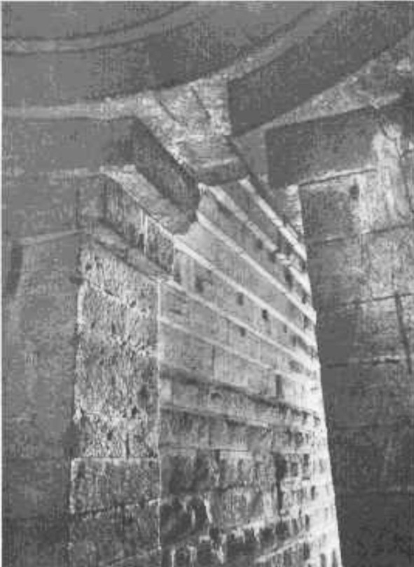 Не подлежит сомнению художественно-эстетическая мотивировка отмеченного выше приема, примененного в кладке уступчатых покрытий дромоса. Совершенно иными причинами была обусловлена гладкая кладка на боковых стенах дромоса, близ входа в него. На расстоянии примерно 7.5 м от начала дромоса кладка его стен выполнена из плит без рустов. Полоса такой кладки имеет в длину 2.90— 3.30 м, высота ее теперь около 2.45 м.