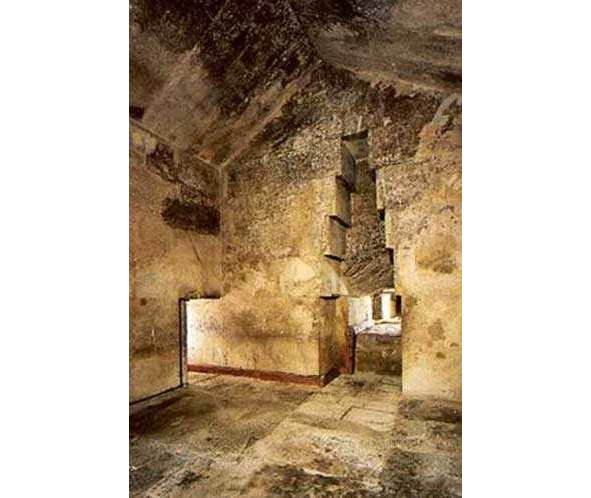 высота камеры – 8,84 м, форма до 8 слоя – прямоугольная (параллелепипед), а от 9 слоя до 22 слоя – конусообразная со ступеньками в виде кругов из известняка или камня,