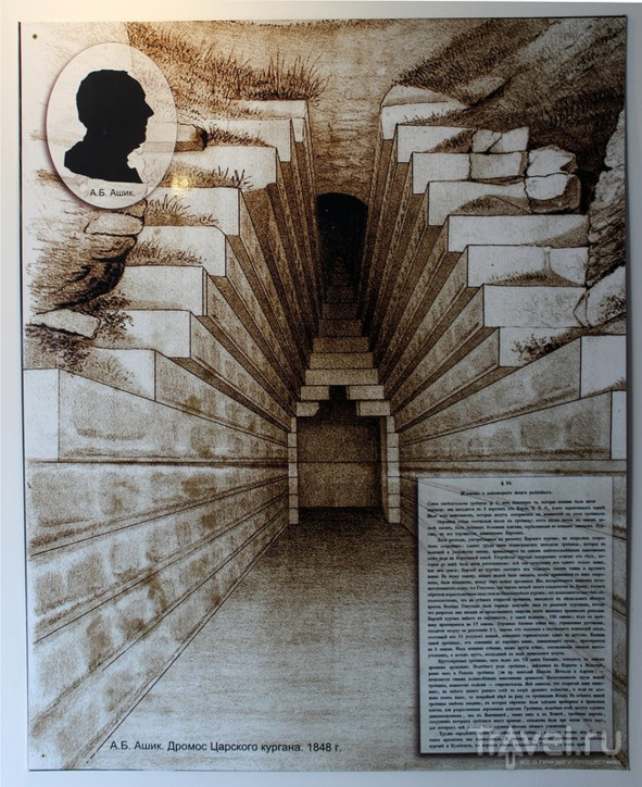 Высота Царского кургана в момент раскопок составляла 17 м, окружность – около 250 м (рис. 4). Камера расположена в центре кургана. С юга на север, со стороны моря, в нее ведет каменный дромос длиной в 36 м и шириной в 2,8 м. Он сложен насухо из рустованных квадров местного известняка, подобного тому, который и сейчас добывается в расположенных вблизи знаменитых Аджимушкайских каменоломнях. Рустованные квадры имеют гладко отесанную по краям полосу и далеко выступающую, грубо обработанную среднюю часть. Такая обработка лишала многочисленные ряды кладок дромоса скучного однообразия, придавала им рельефность и усиливала монументальность сооружения. По мере приближения к камере, стены дромоса постепенно повышаются, а около середины длины его начинается перекрывающий его уступчатый свод, замкнутый на высоте 7,14 м от земляного пола дромоса. Так, на протяжении 20 м дромос представляет собой коридор, на семи рядах вертикальных стен которого лежат одиннадцать нависающих рядов свода. Вблизи камеры дромос также слегка расширяется, и этим усиливается нарастающее ощущение грандиозности, еще более увеличивающееся при входе в камеру. В камеру пройти легко, так как уровень ее пола одинаков с уровнем пола дромоса. Она почти квадратной формы и не слишком большая (4,40 м х 4,24 м), но поразителен ее уходящий вверх конический свод. Архитектором искусно решен переход от квадратной камеры к круглому куполу. Весь купол состоит из двенадцати таких концентрических уменьшающегося диаметра выступающих колец, а на высоте 8,73 м от пола он перекрыт гладкой плитой.